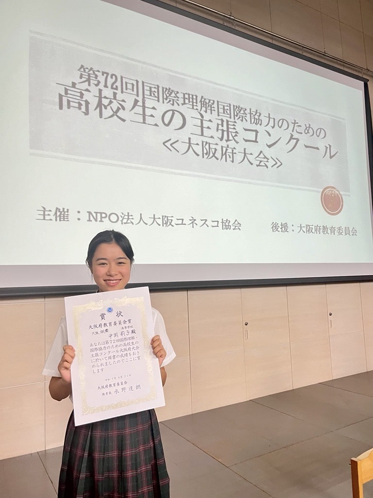 令和7年9月21日(日)に、ピース大阪で行われた、NPO法人大阪ユネスコ協会主催「第72回国際理解・国際協力のための高校生の主張コンクール《大阪大会》」に、高校1年生の平岡莉子さんが出場し、大阪府教育委員会賞を受賞しました。このコンクールは、高等学校生徒に対し国際連合についての主張を通して、国際理解・国際協力について考える機会を提供することを目的としています。