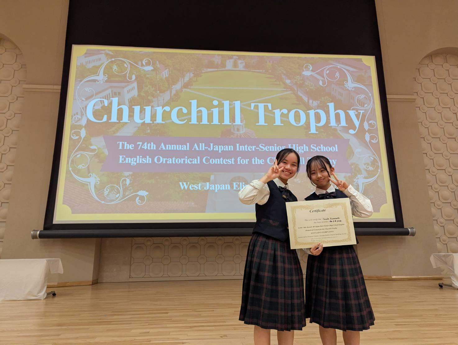 「第74回チャーチル杯争奪全日本高等学校生英語弁論大会」(関西学院大学ESS・青山学院大学ESS主催)の西日本予選に、第1次予選を通過した高校1年生の川元春花さんと、クエン クイン アンさんが出場しました。チャーチル杯は、全国の高校生を対象とした英語弁論大会で、1952年から始まった歴史ある大会です。 川元春花さんが6位に入賞し、11月に東京で実施される本選に出場することが決定しました。