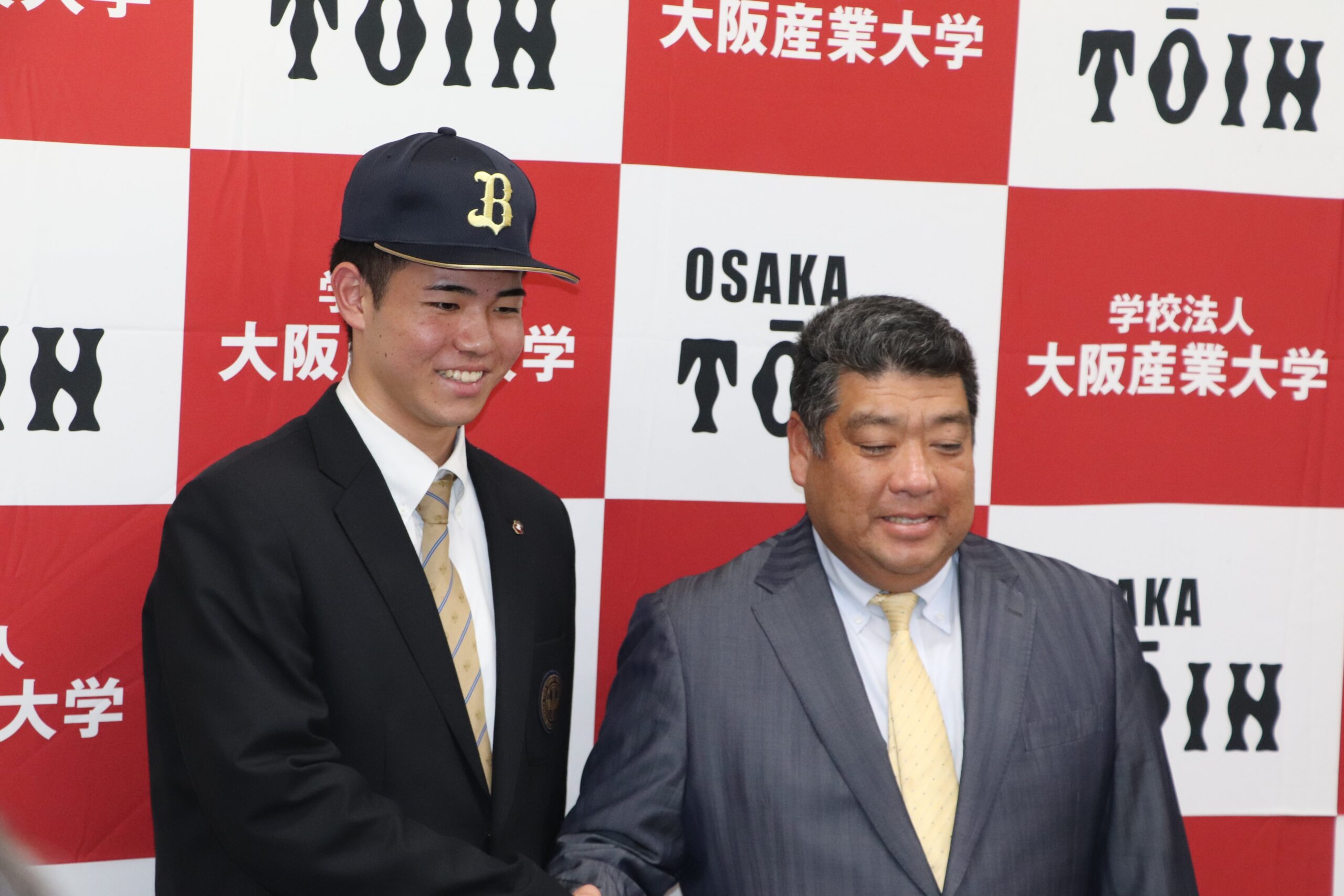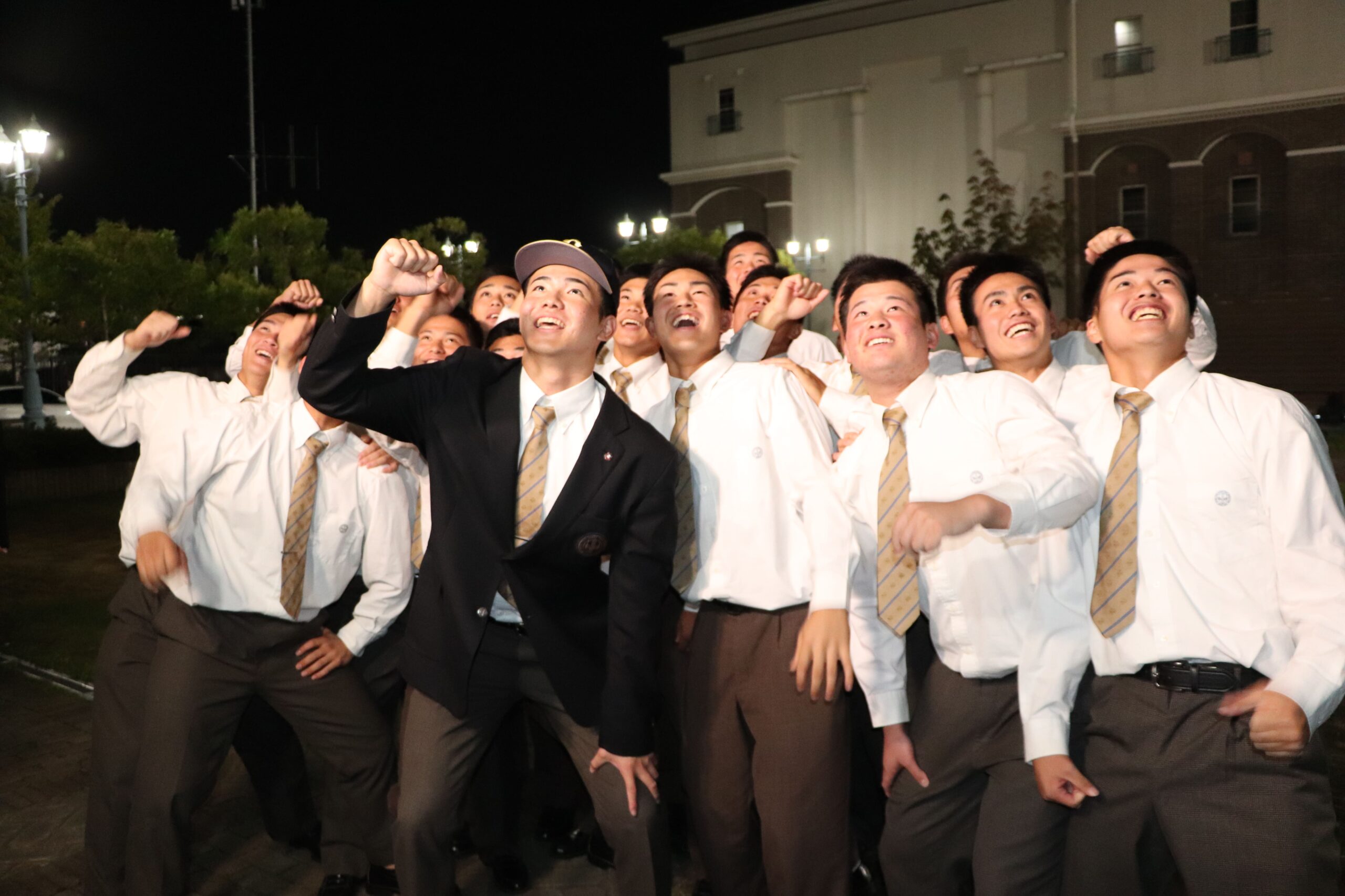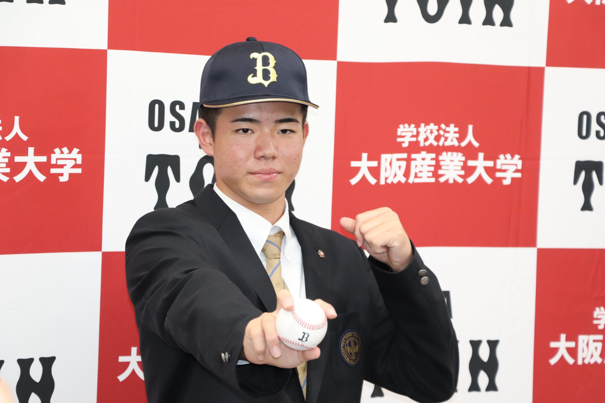 令和7年10月23日(木)に行われたプロ野球ドラフト会議で、高校Ⅲ類硬式野球部の森陽樹選手が、オリックス・バファローズから2位指名を受けました。森さんは、指名後、今田校長、西谷監督とともに会見に臨み、球団の印象やプロでの目標など、しっかりと受け答えしていました。その後、3年間苦楽をともにした野球部の生徒から胴上げされ、祝福の輪の中で、飛び切りの喜びの表情を見せていました。