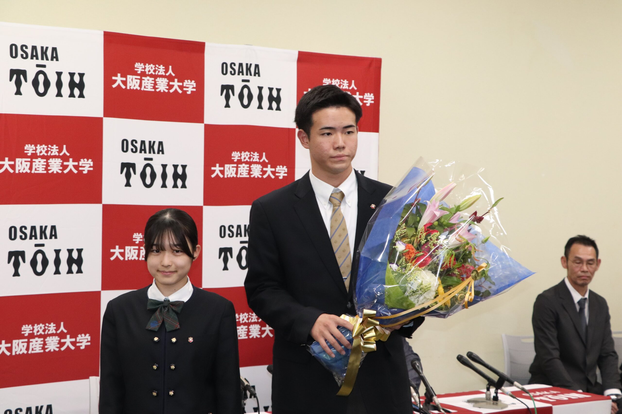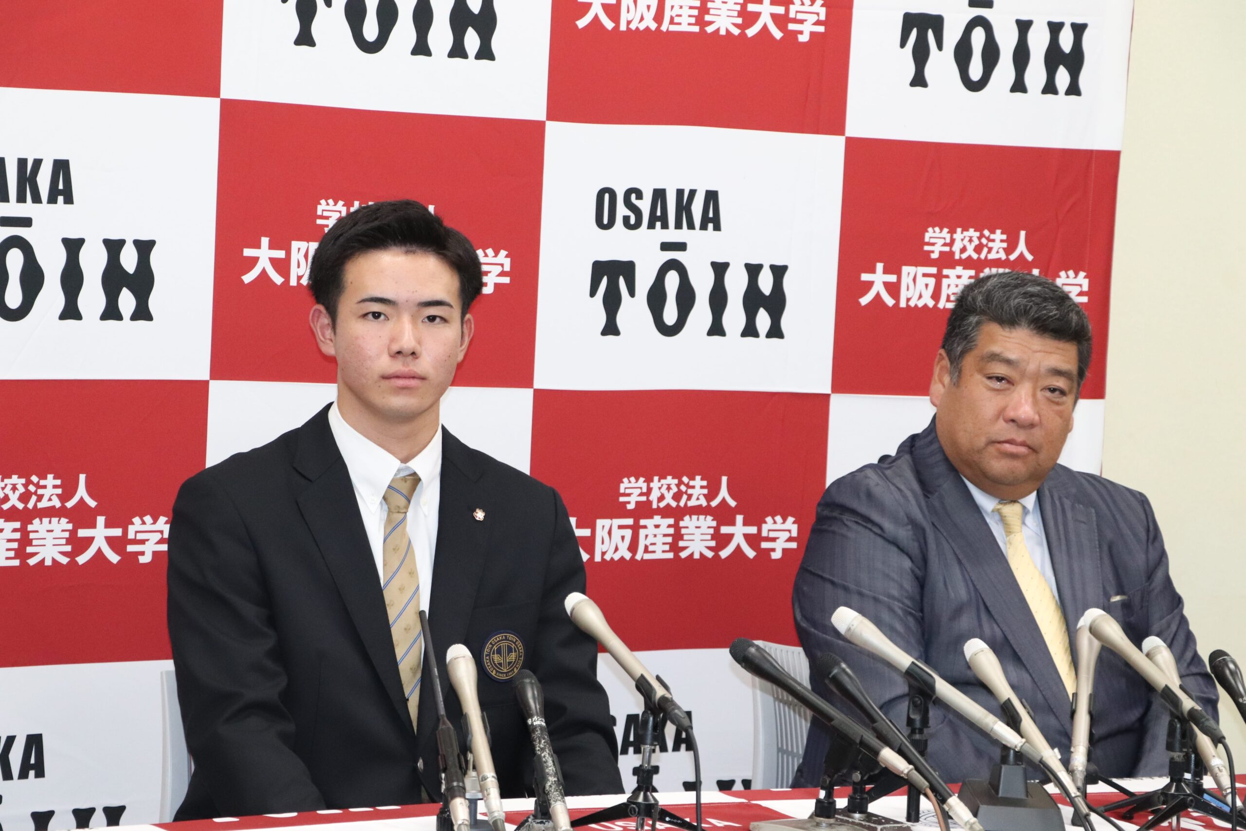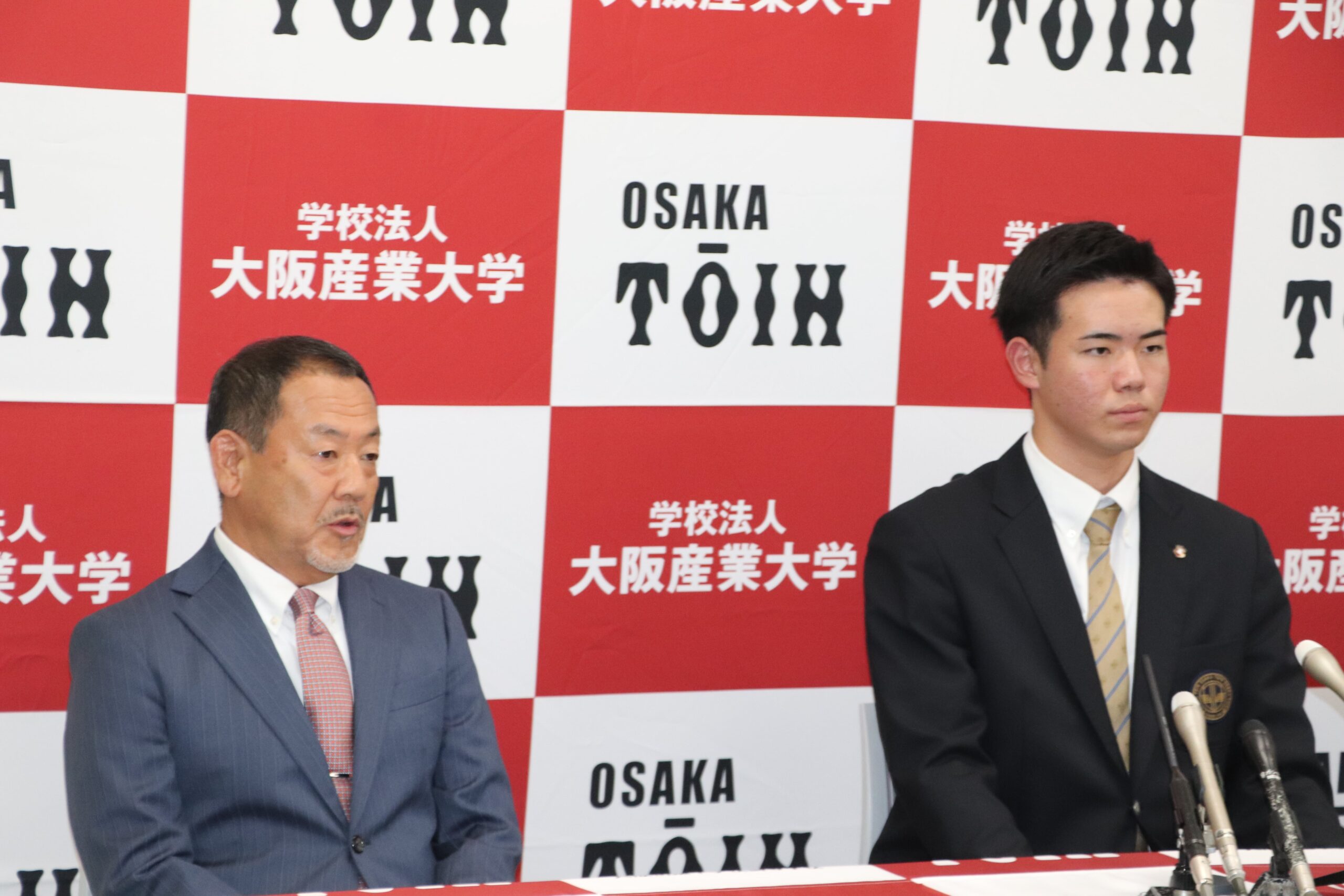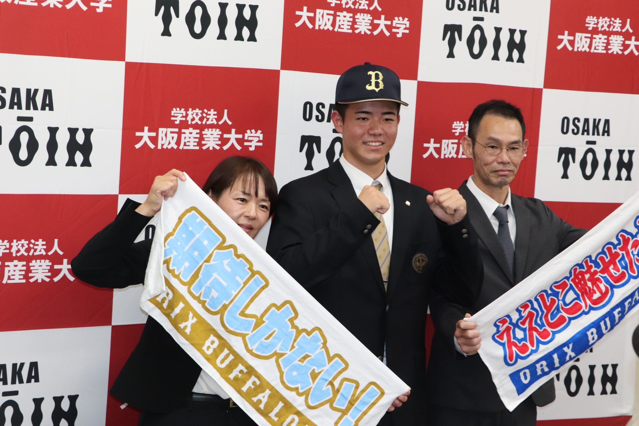 令和7年10月23日(木)に行われたプロ野球ドラフト会議で、高校Ⅲ類硬式野球部の森陽樹選手が、オリックス・バファローズから2位指名を受けました。森さんは、指名後、今田校長、西谷監督とともに会見に臨み、球団の印象やプロでの目標など、しっかりと受け答えしていました。その後、3年間苦楽をともにした野球部の生徒から胴上げされ、祝福の輪の中で、飛び切りの喜びの表情を見せていました。