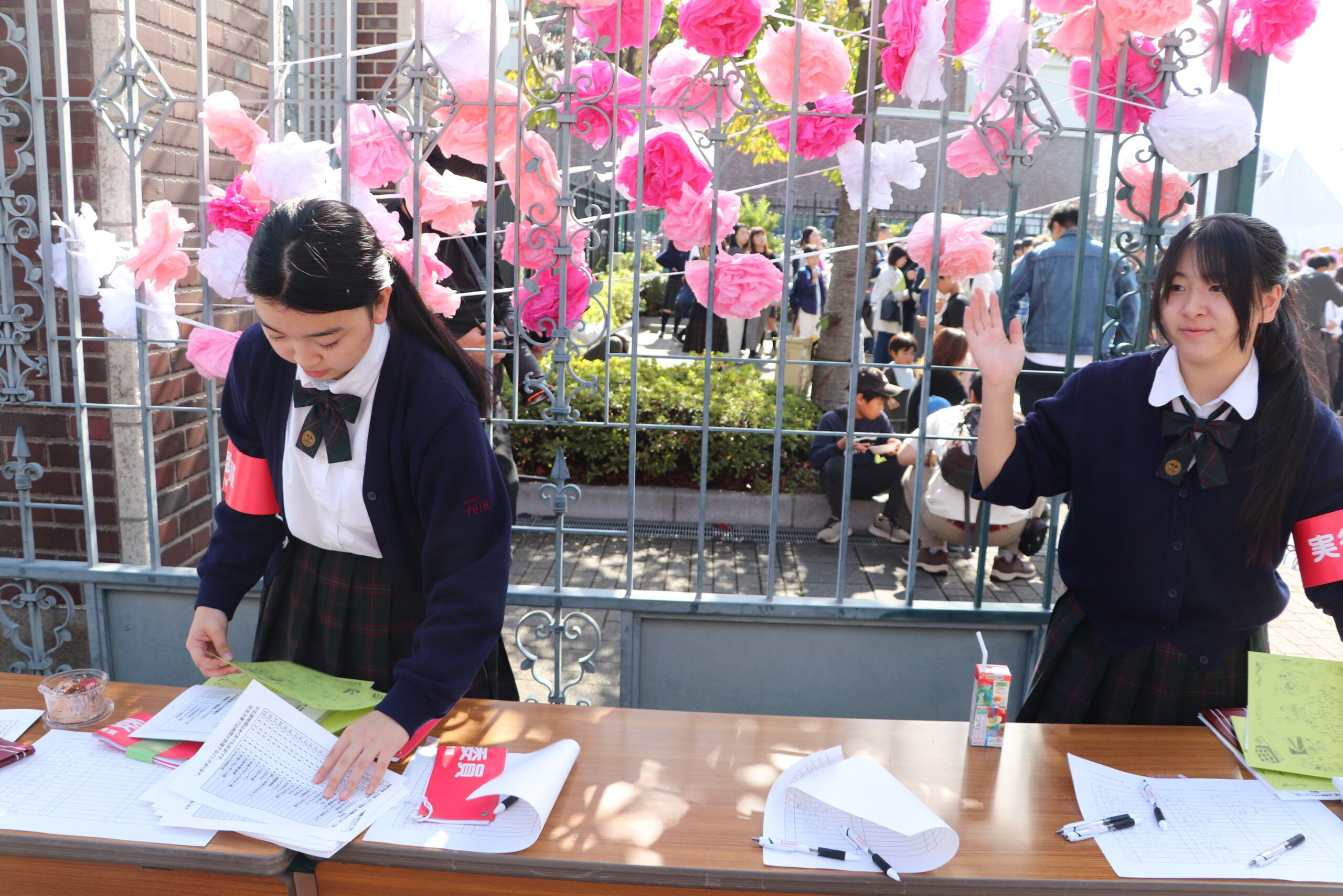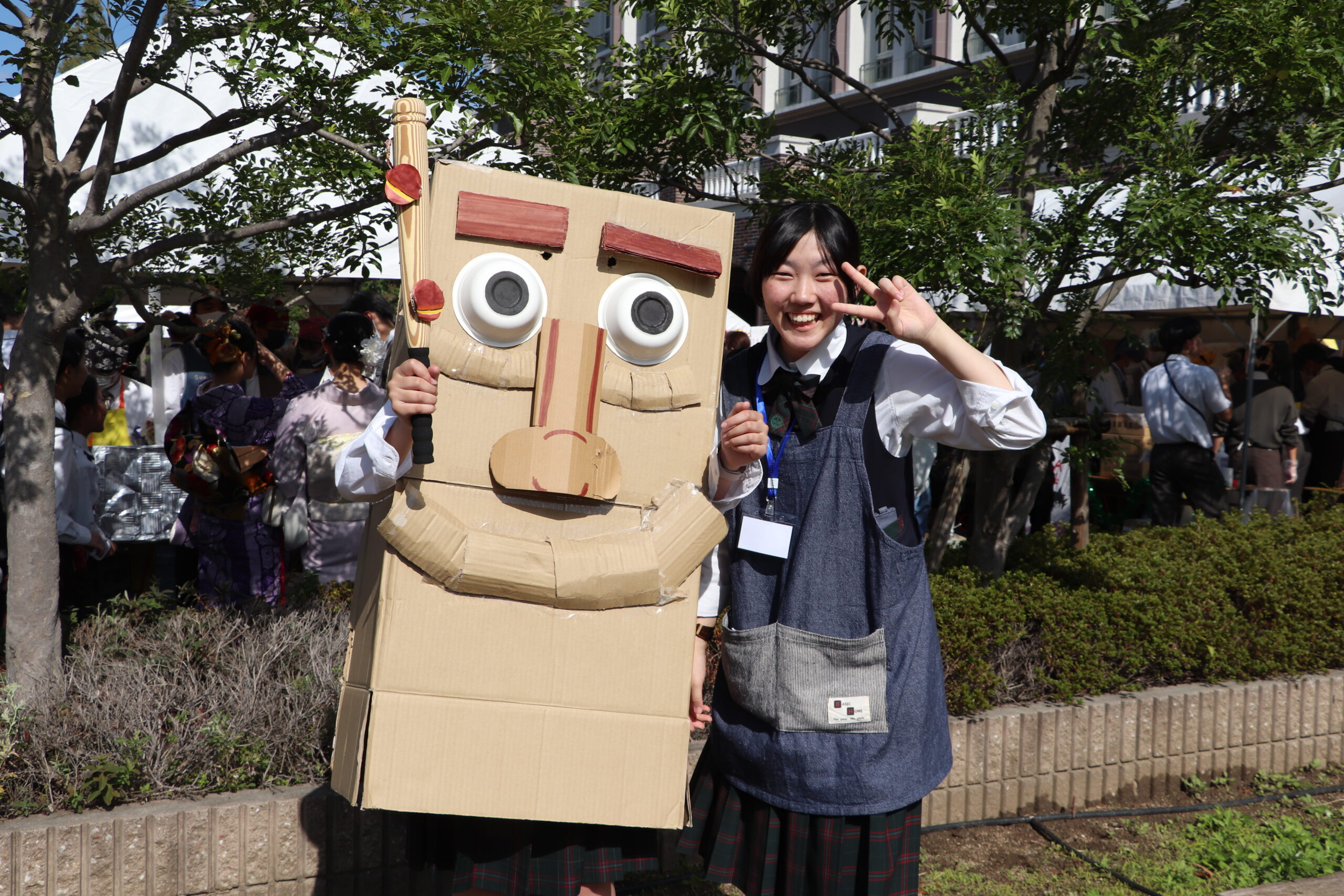 本年度は、9時30分から本館及びアリーナでPW(プロジェクトワーク)を中心とした展示発表、10時から高校1、2年生のクラスを中心とした模擬店、10時30分から部活動や一芸さんによるステージ発表がスタートしました。これに生徒会企画の「迷路」なども加わり、多彩な催しの中で生徒たちは忙しくも楽しい時間を過ごしていました。