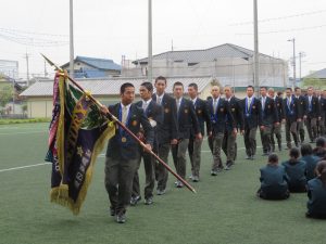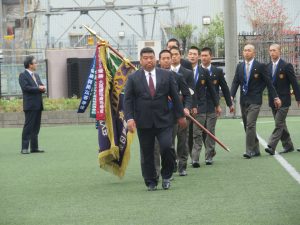 2018年04月06日 4月6日(金)、本校グラウンドにて、第90回記念選抜高校野球大会の優勝報告会が行われました。優勝旗を手に選手諸君が入場し、西谷浩一監督の挨拶に引き続いて、中川卓也主将が甲子園優勝の報告を行いました。